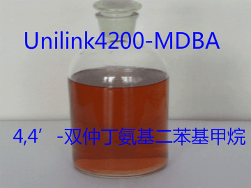 膠粘劑 - 4,4’-雙仲丁氨基二苯基甲烷-MDBA使得基層更好地潤濕,熟化后的聚合物與涂敷的表面更好地粘著。硬彈性體- - 4,4’-雙仲丁氨基二苯基甲烷,Unilink4200-MDBA可用于MDI半預聚物的熟化,以生產一系列硬度高的彈性體。